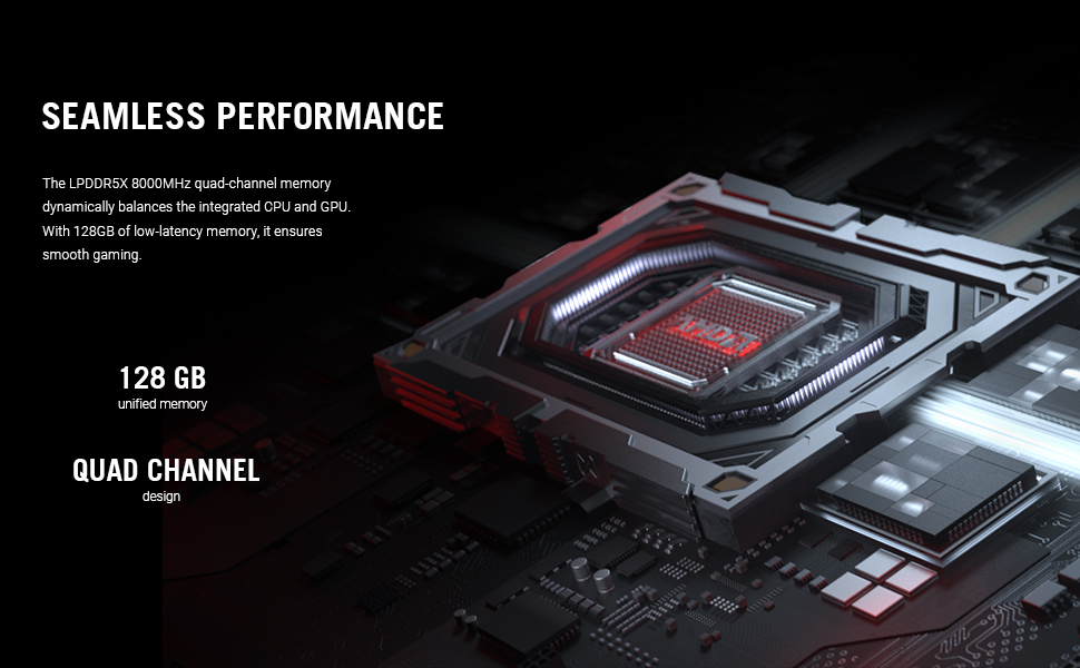 SEAMLESS PERFORMANCE – The LPDDR5X 8000MHz quad-channel memory dynamically balances the integrated CPU and GPU. With 128GB of low-latency memory, it ensures smooth gaming.