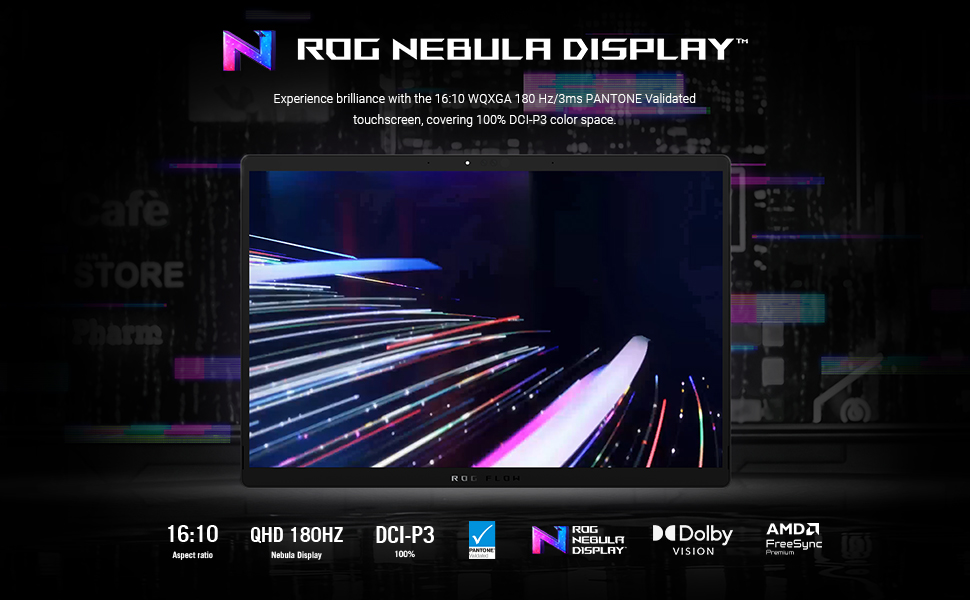 ROG NEBULA DISPLAY, BRILLANCE UNLEASHED – Experience brilliance with the 16:10 WQXGA 180 Hz/3ms PANTONE Validated touchscreen, covering 100% DCI-P3 color space.