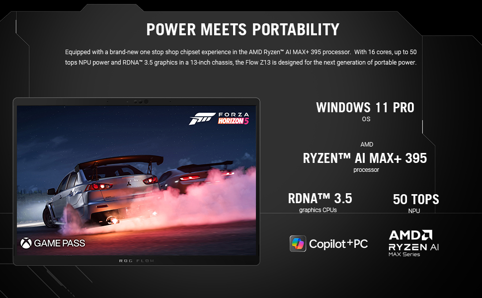 POWER MEETS PORTABILITY – Equipped with a brand-new one stop shop chipset experience in the AMD Ryzen AI MAX+ 395 processor. With 16 cores, up to 50 tops NPU power and RDNA 3.5 graphics in a 13-inch chassis, the Flow Z13 is designed for the next generation of portable power.