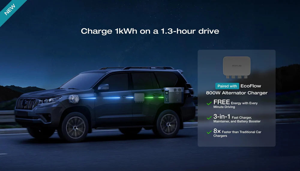 Never run out of power on your road trips with the EcoFlow 800W Alternator Charger. Utilize the excess energy generated by your vehicle to turn every minute on the road into a free battery recharge.
