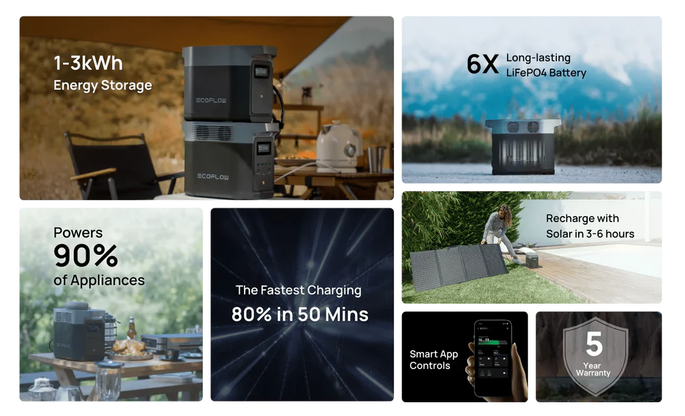 With a capacity of 1kWh to start with, you've got enough energy for your essentials for hours on end. Need even more? Add on the DELTA 2 extra battery to reach 2048Wh, the DELTA Max Smart Extra Battery to hit 3040Wh, or the DELTA 2 Max Smart Extra Battery for an impressive 3072Wh. Great for home backup or everyday appliances.