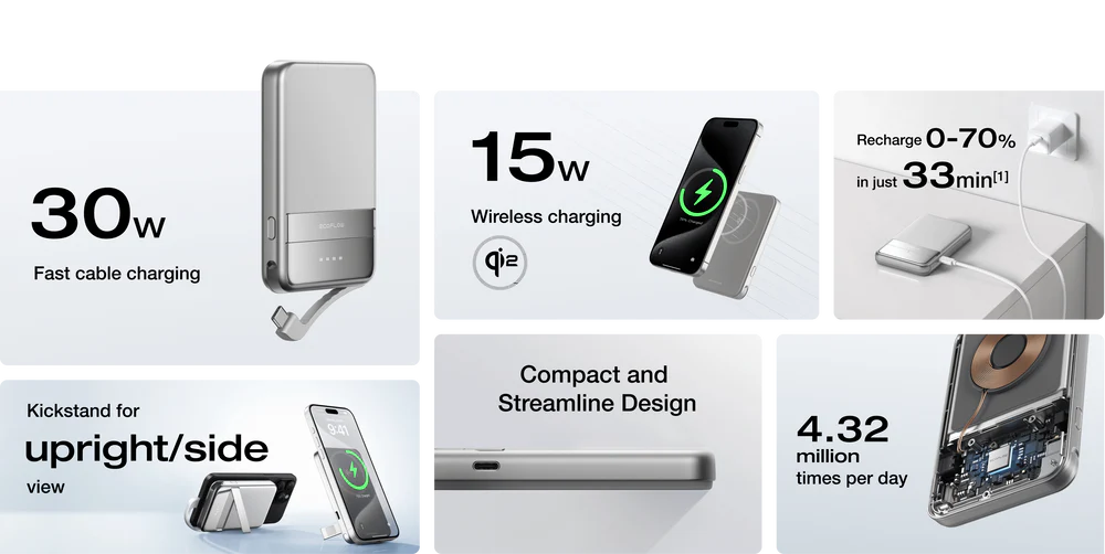 RAPID uses patented X-Stream technology for flagship smartphone-level energy density and fast charging capability. Plus, it works with the PD3.0 protocol for flash charging and recharging. Paired with Qi2-certified wireless charging and a built-in cable design, RAPID ensures snap-on charging convenience with maximum charging speeds.