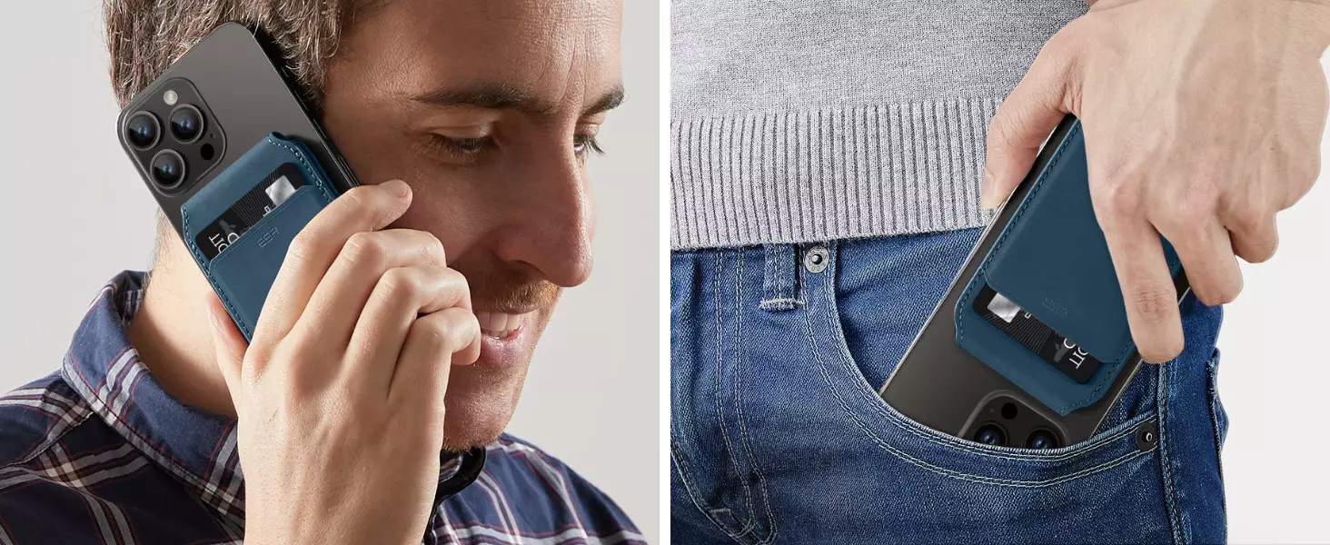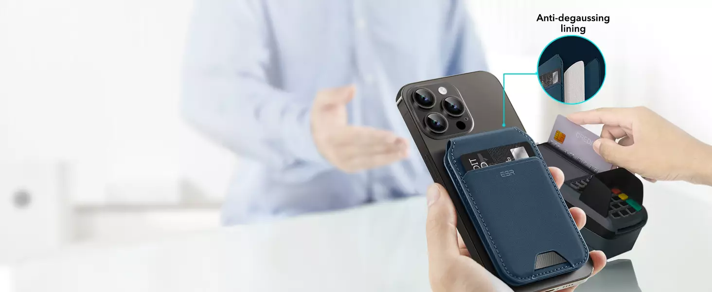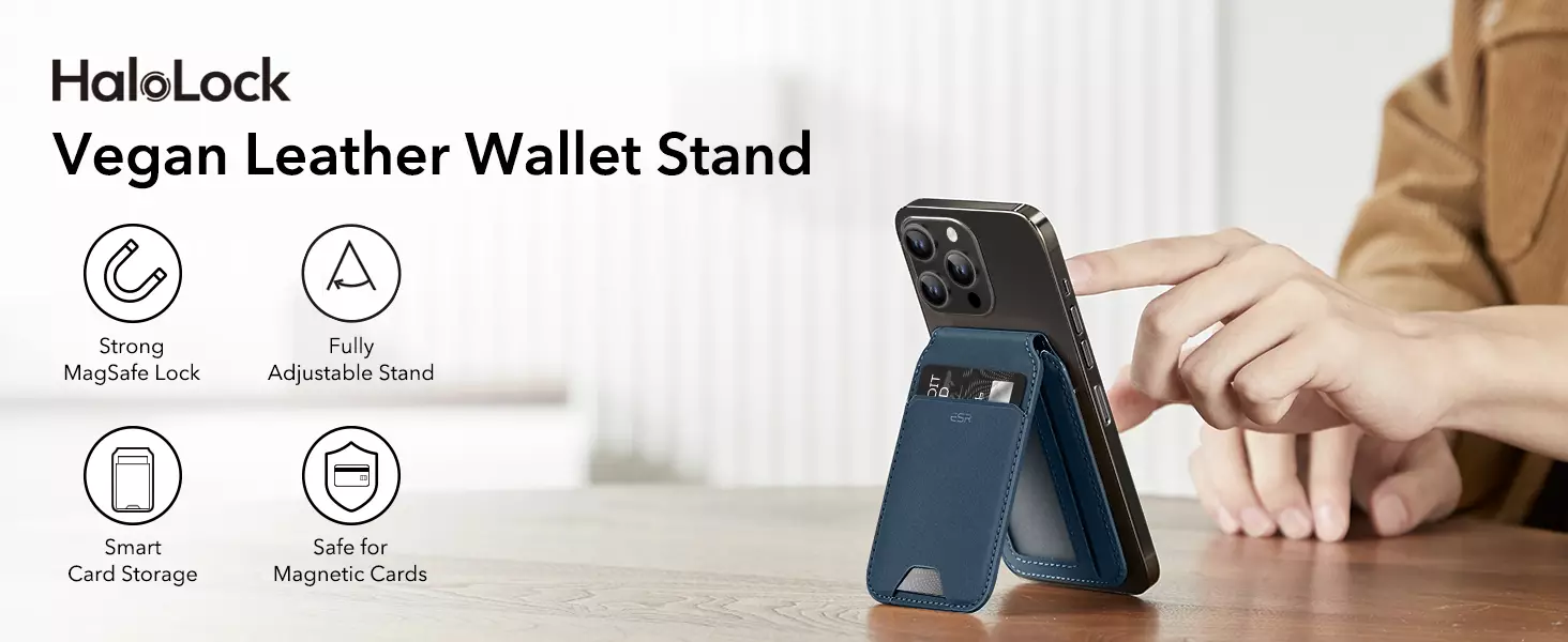 Magsafe Wallet & Stand by ESR made from Vegan Leather by ESR brings Stronger Magnetic Lock: powerful magnets are 20% stronger than the official magnetic wallet to ensure that your wallet stand stays securely attached.