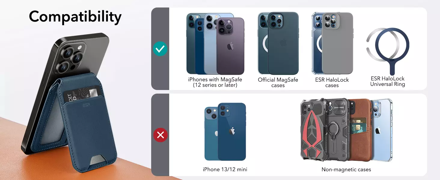 Compatibility: only compatible with iPhone 14 / iPhone 14 Pro / iPhone 14 Plus / iPhone 14 Pro max /iPhone 13/13 Pro/13 Pro Max/12/12 Pro/12 Pro Max, official MagSafe cases and ESR HaloLock cases; not compatible with iPhone mini