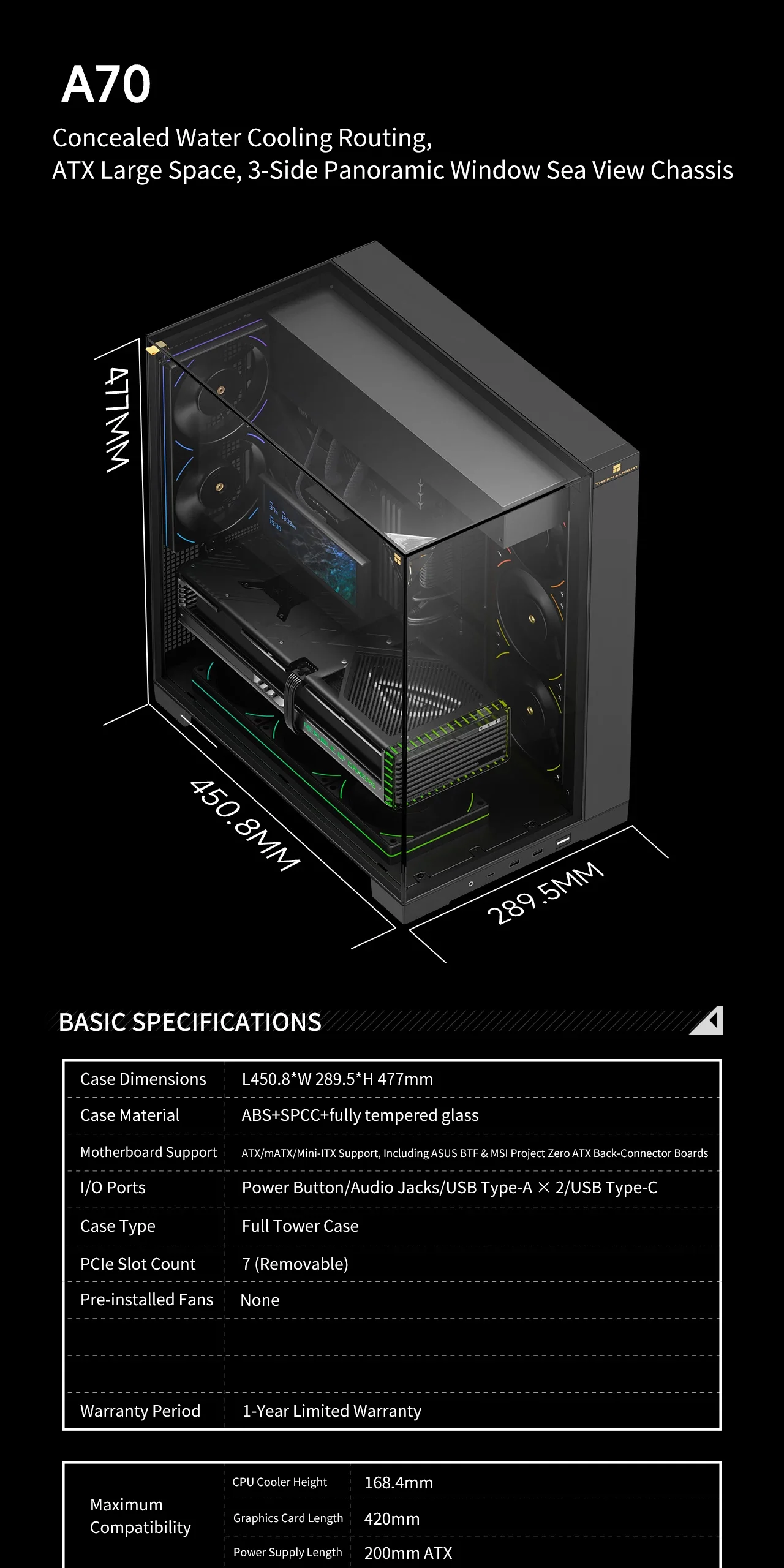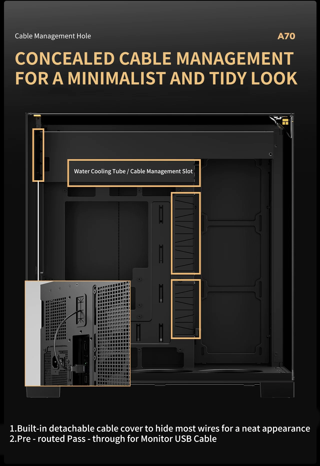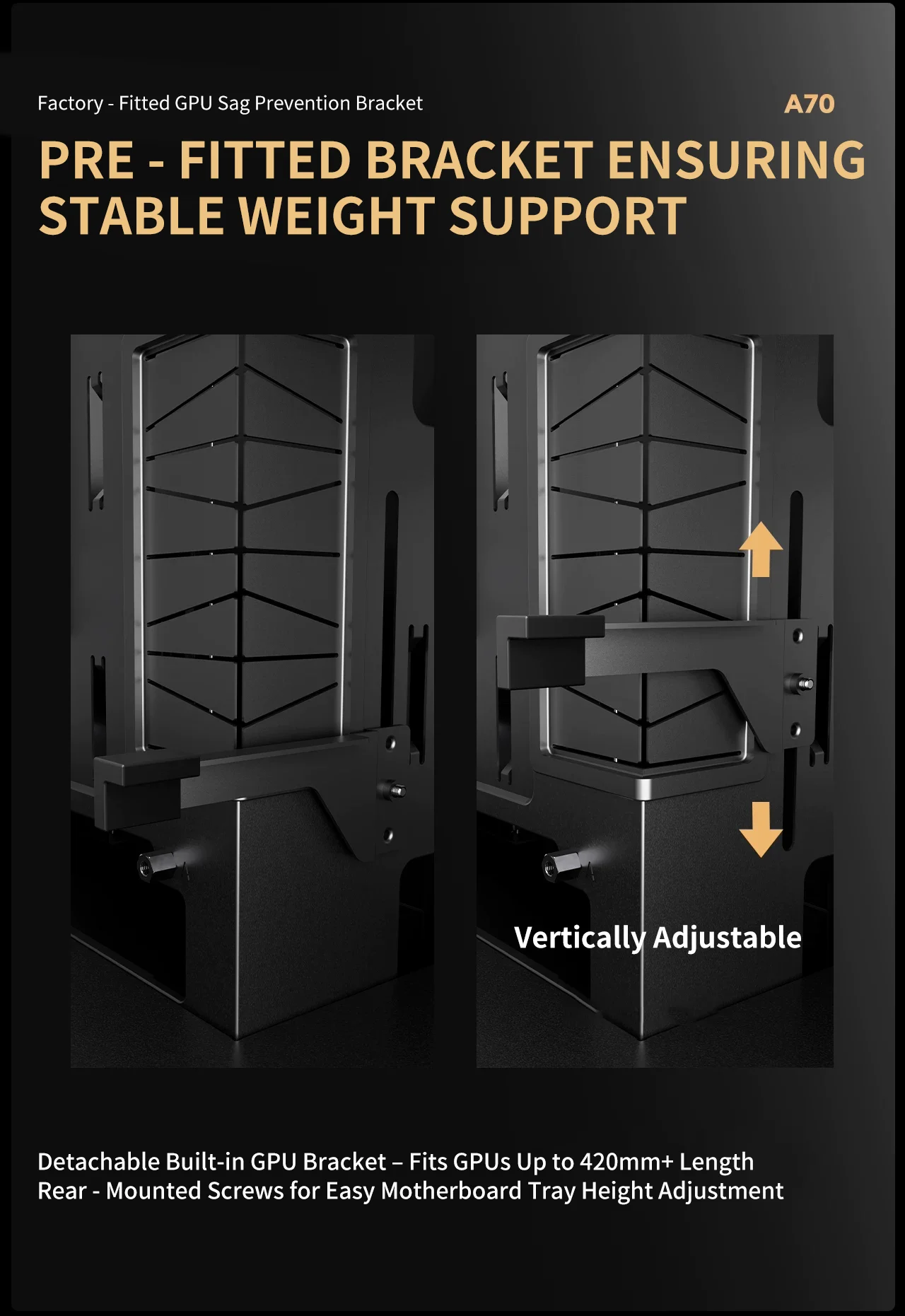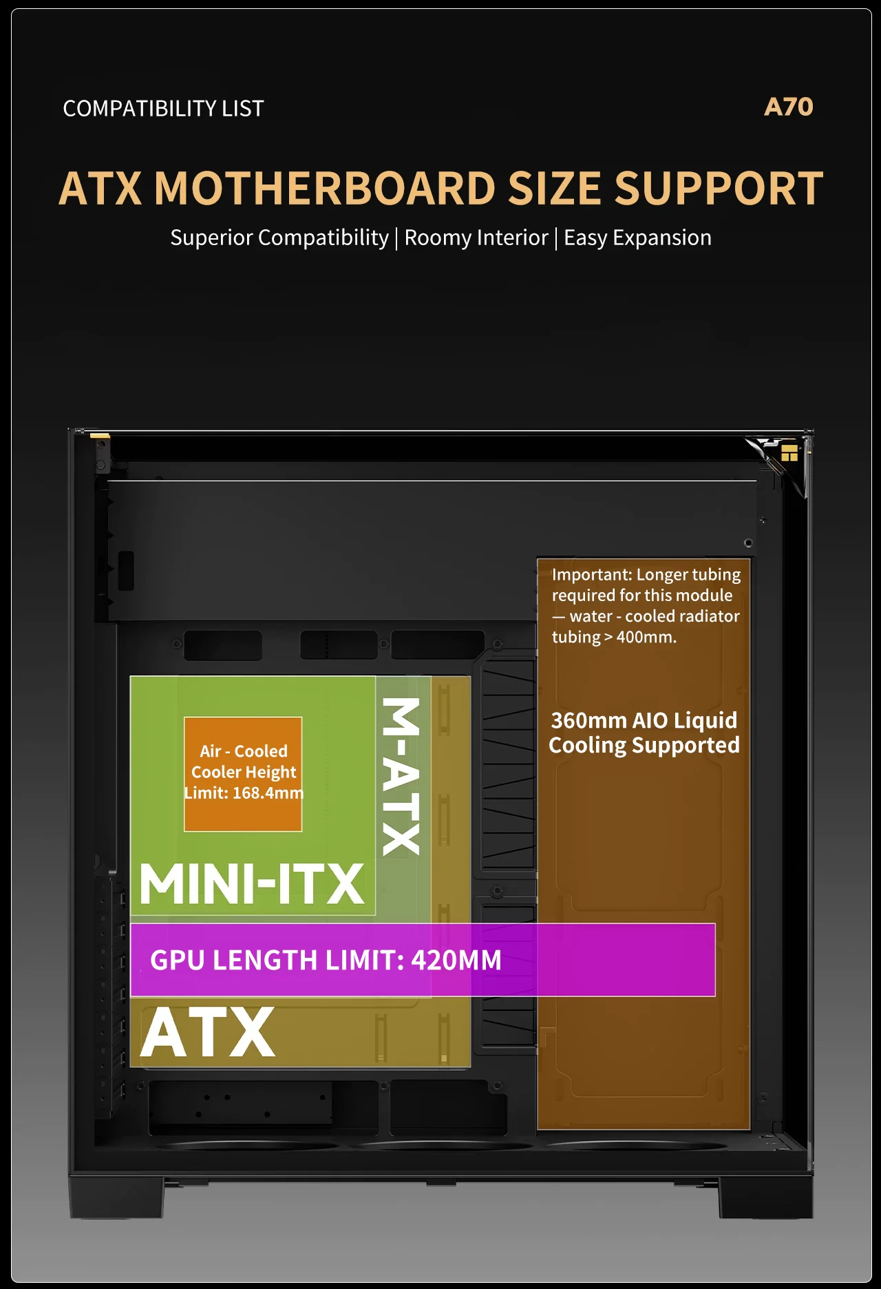 The internal volume of the TR-A70 is optimized for airflow and component clearance. The 420mm GPU limit allows for cards like the RTX 4090 or the RX 7900 XTX to fit without obstruction, provided the card is not excessively thick. Similarly, the 200mm PSU limit ensures that standard ATX power supplies fit snugly without requiring a cutout. This specification is critical for users who want to avoid the does it come with fan dilemma regarding airflow; the case includes a robust fan configuration that works in tandem with the GPU to maintain optimal temperatures.